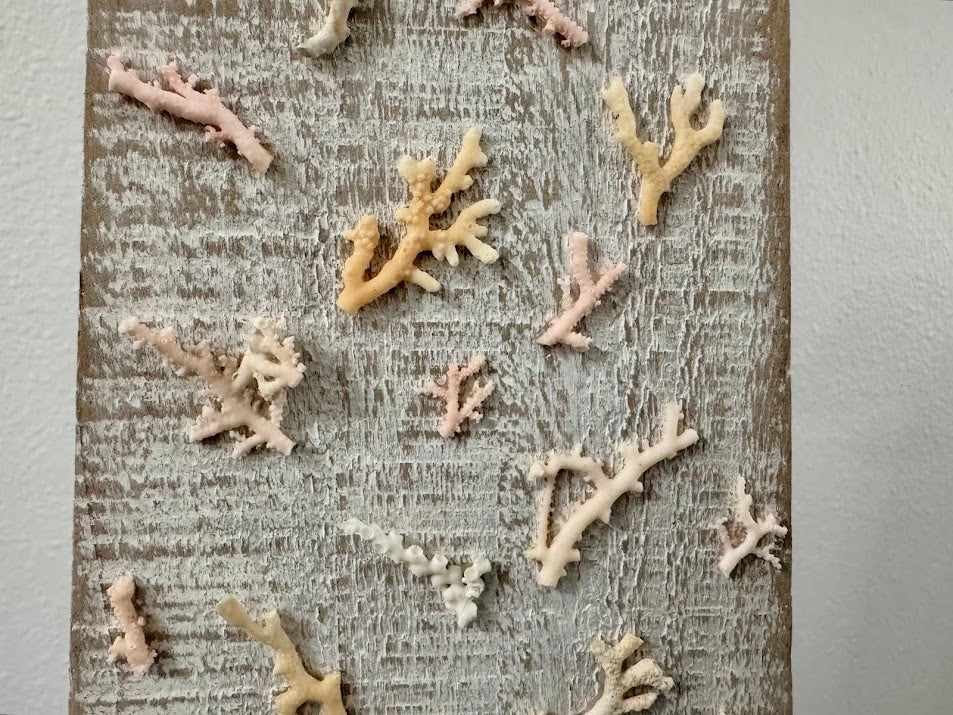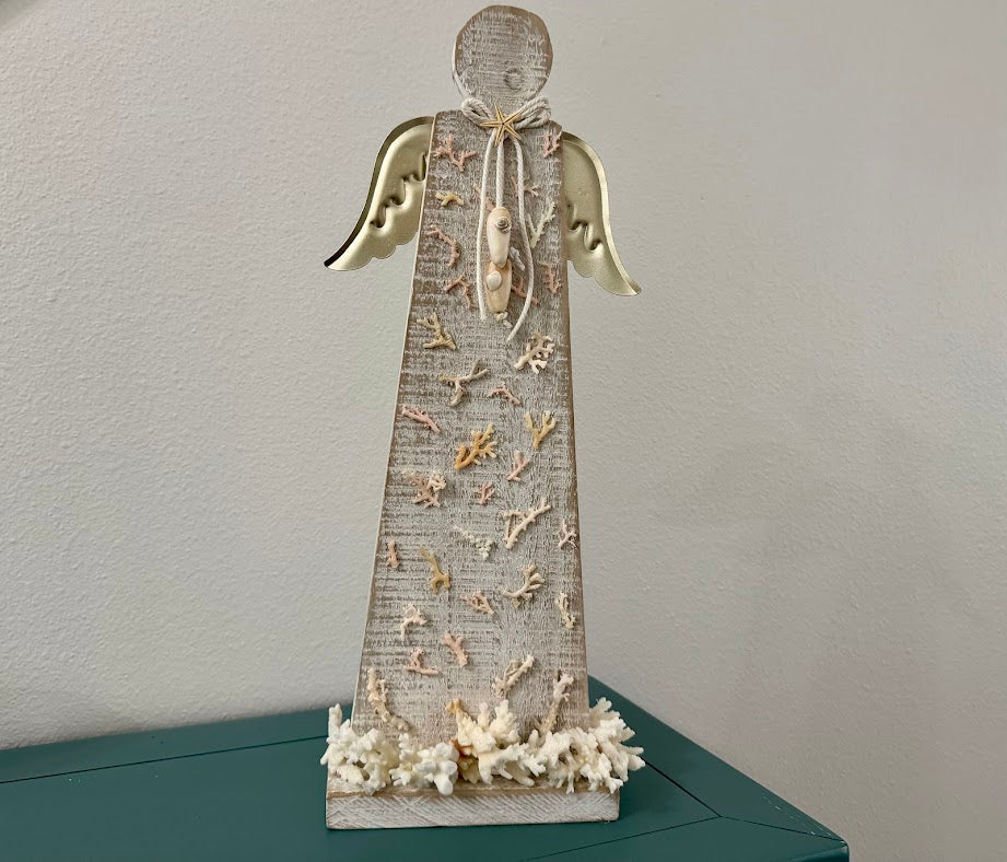 This 17.5" modern wooden angel with metal wings is adorned with delicate coral pieces on her dress, olive shells on her bow, and more coral at the base. This angel can sit on your shelf at the Christmas Holidays or throughout the year adding a touch of coastal inspiration.