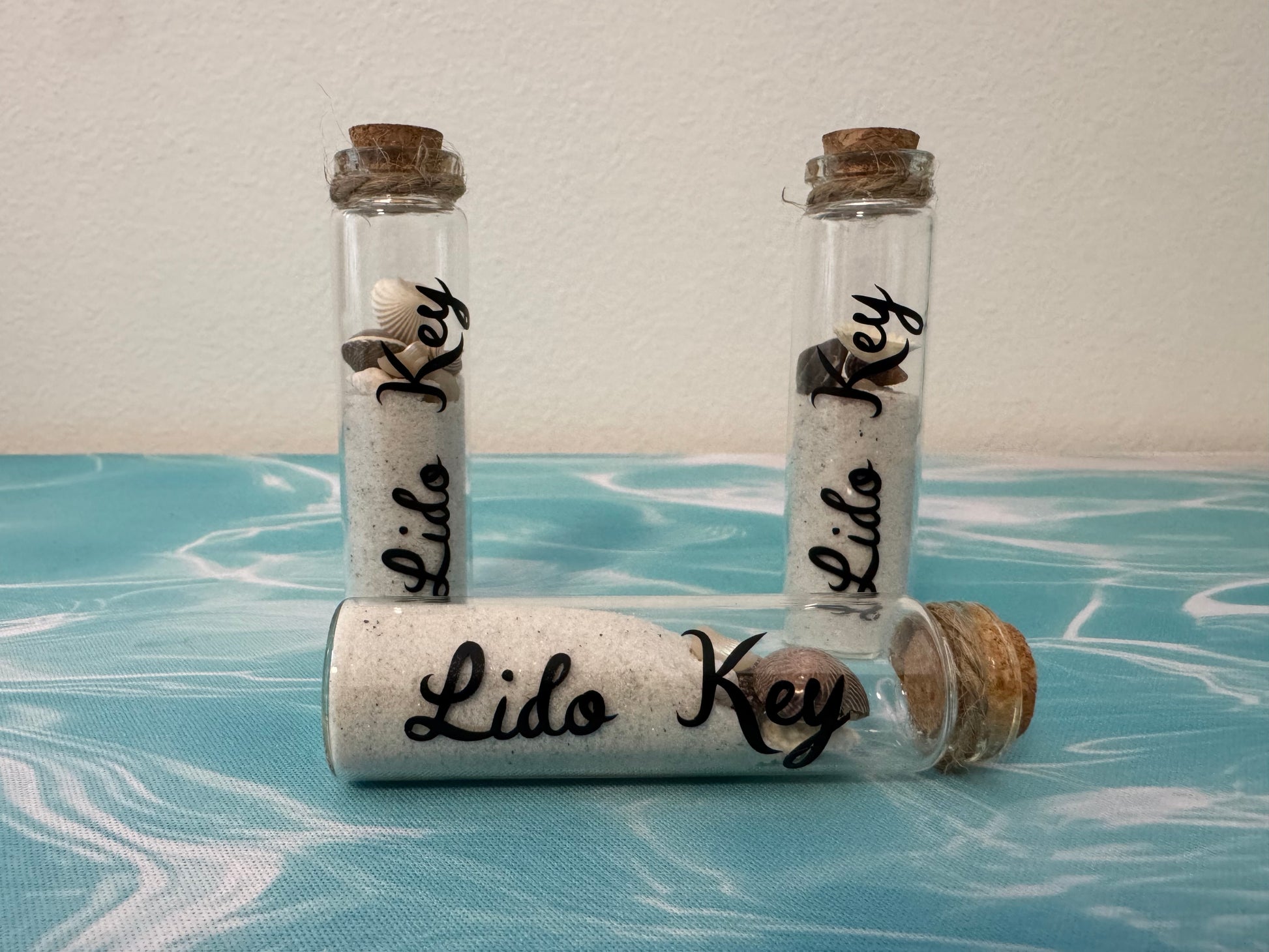 Lido Key - sand and shells sealed in a 3.25” x .75” bottle. Great as a keepsake, favorite, or add a little coastal decor. I can also make custom bottles for parties or weddings. (Note - sand is not from beach. It is illegal in FL to take sand from the beach.) Price is for ONE bottle.