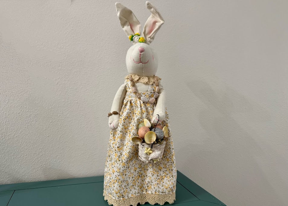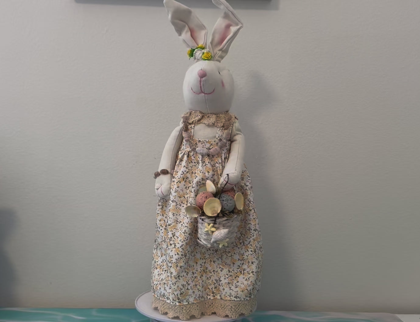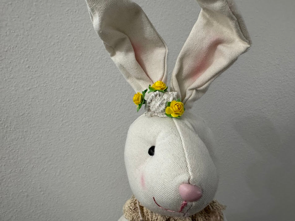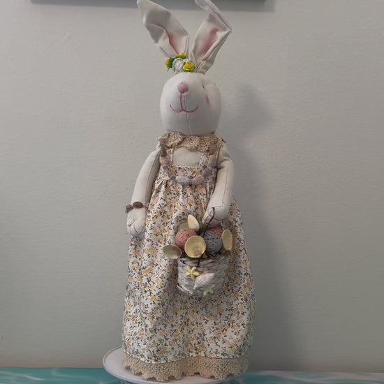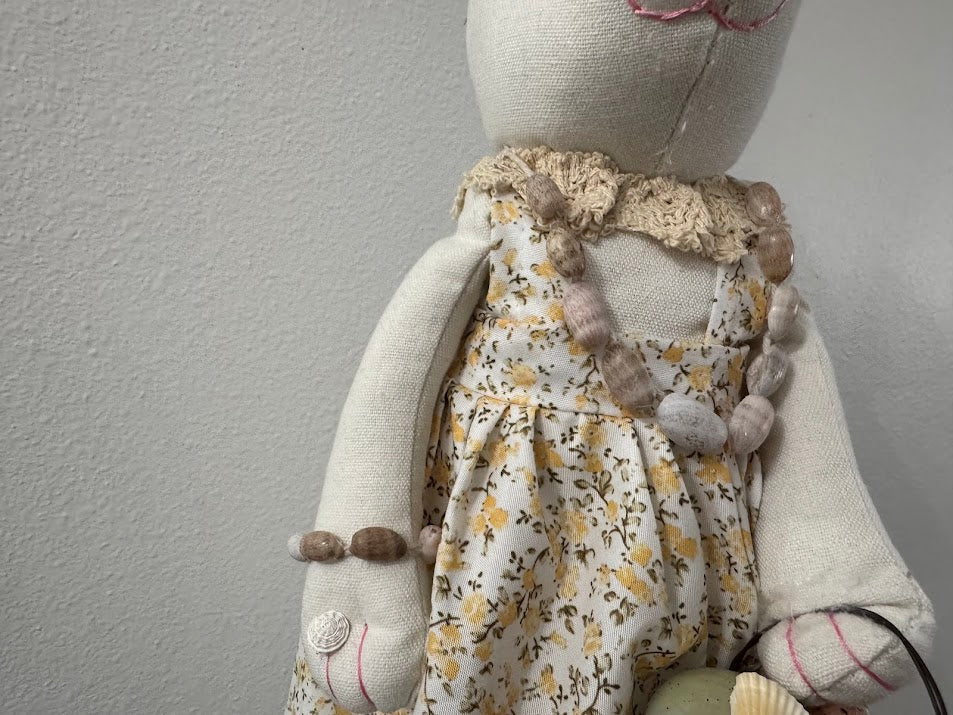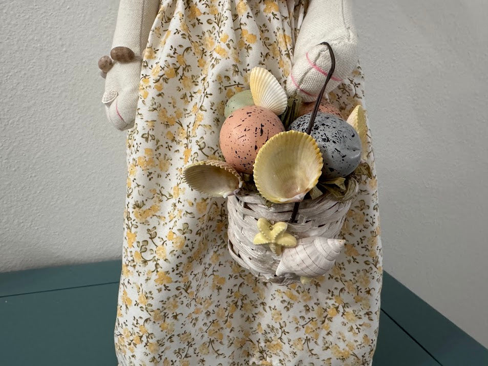 Experience the whimsy of spring with my Coastal Rabbit/Bunny. This 19.5" tall stuffed bunny is perfect for Easter decorations or as a charming addition to any child's room. Adorned with delicate shell accents, including a bracelet, ring, necklace, and basket. This bunny brings a touch of seaside elegance.