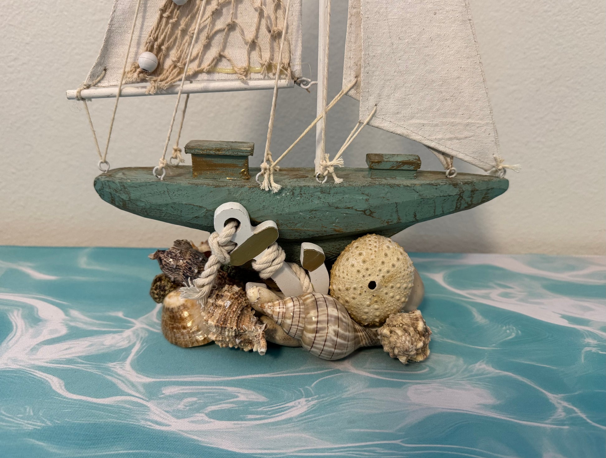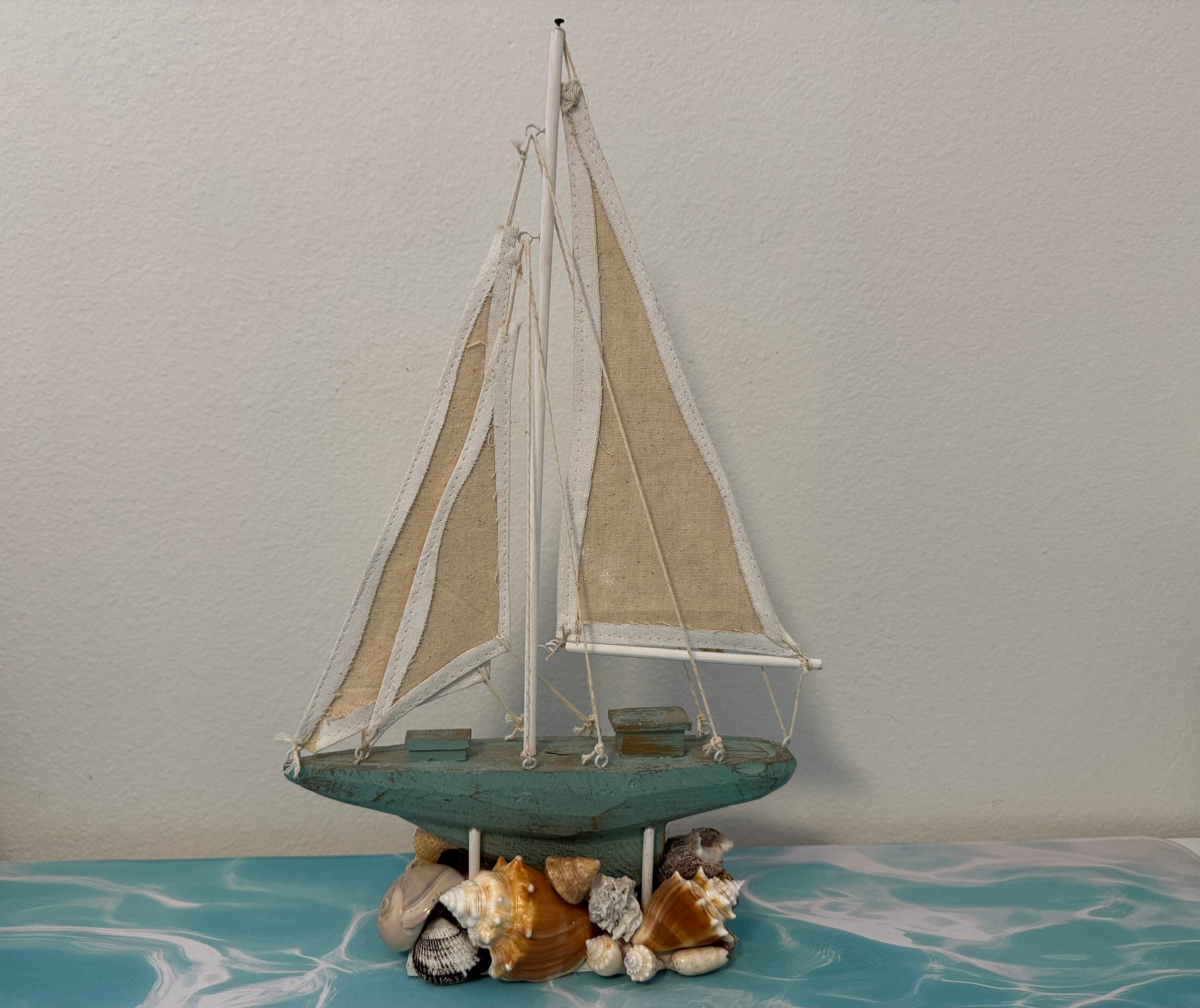 Enjoy the tranquility of the sea with our Coastal Sailboat. This piece features a 17" x 9.5" teal/seafoam green sailboat with beige sails, an anchor, and surrounded by real seashells. Perfect for adding a touch of coastal or nautical charm to any living area or office.