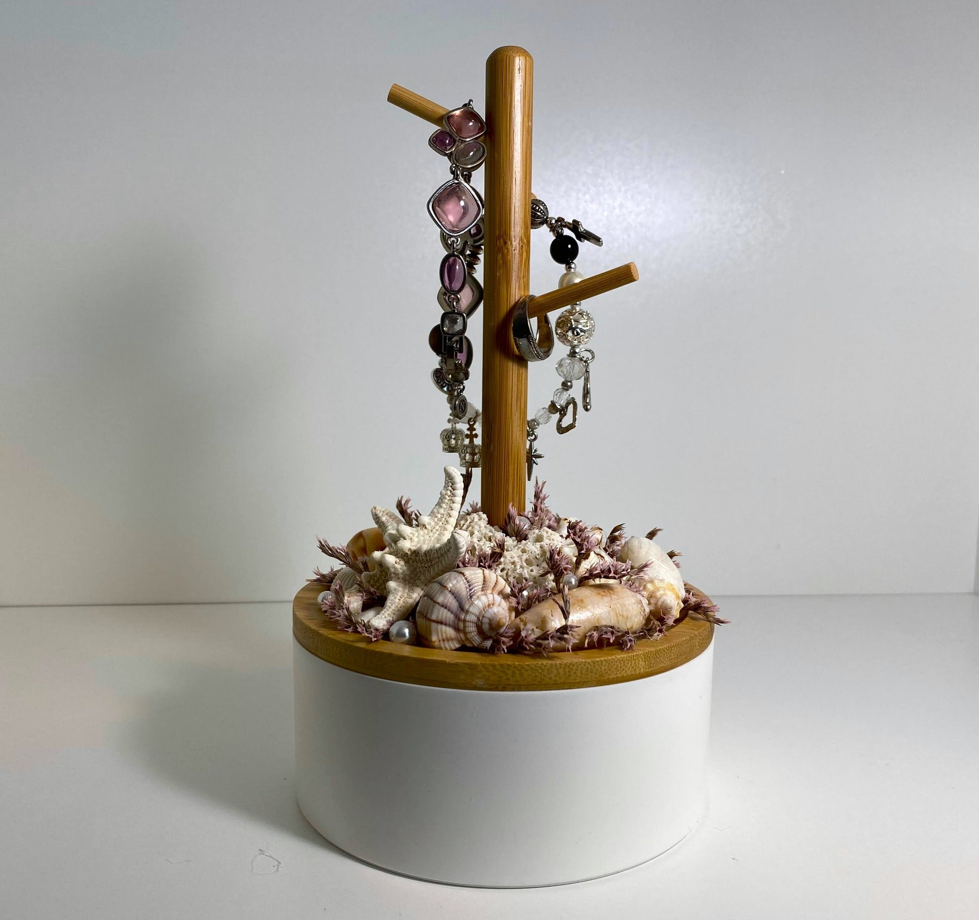 Stunning jewelry tree designed for your precious accessories. This elegant piece features three pegs for hanging rings, bracelets, or a watch; and it cleverly opens up to reveal additional storage space. The base of the tree is adorned with an arrangement of shells, delicate lavender stems, a charming starfish, and artificial pearls. This will add a touch of coastal elegance to your jewelry organization. Elevate your decor and keep your jewelry organized with this beautiful and functional 9.5” tall and 5” wide jewelry tree. (Jewelry in photo NOT included.)