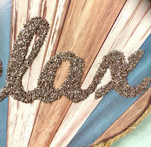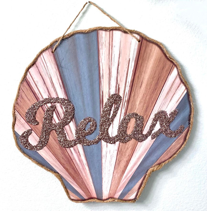 11" tall and 12" wide wooden hanging plaque, artfully shaped like a seashell and adorned with the word "Relax" crafted from crushed glass. The soothing blue and warm beach colors of this piece evoke a sense of coastal tranquility, making it a perfect addition to your home decor. It's a gentle reminder to unwind and enjoy the serene vibes of the seaside.
