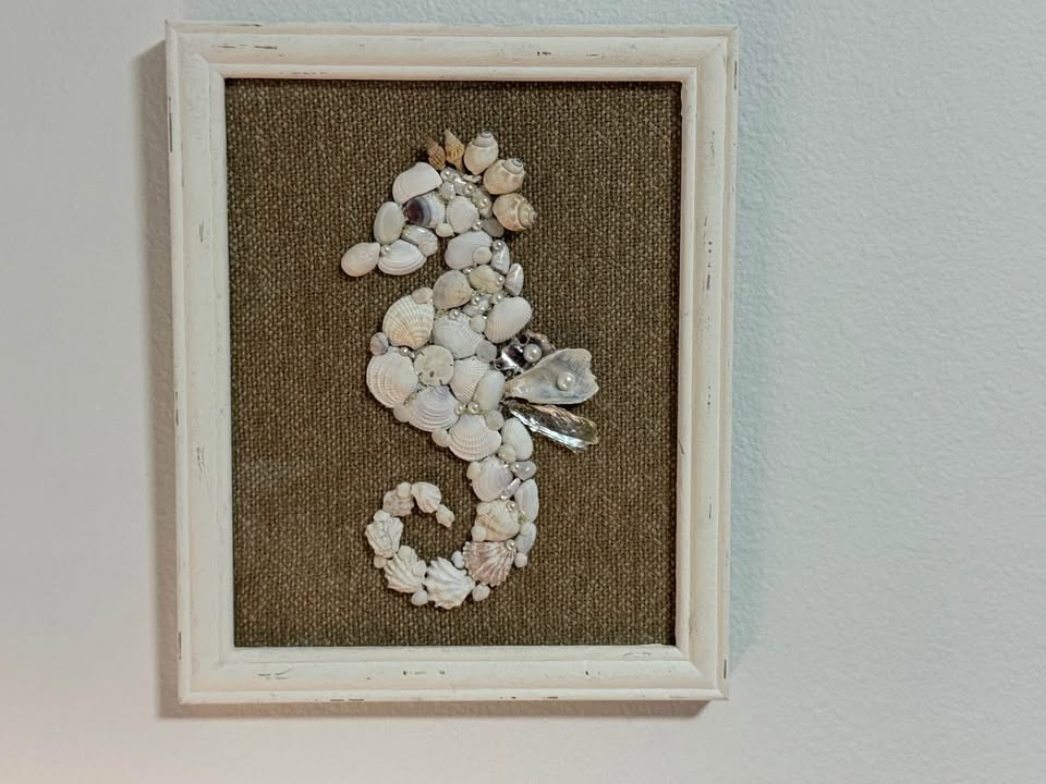 This beautifully crafted 9.5” by 11.25” white, distressed frame showcases a unique seahorse design I made with local SW Florida shells. Enhance your beach home decor with this one-of-a-kind piece that captures the essence of coastal living.