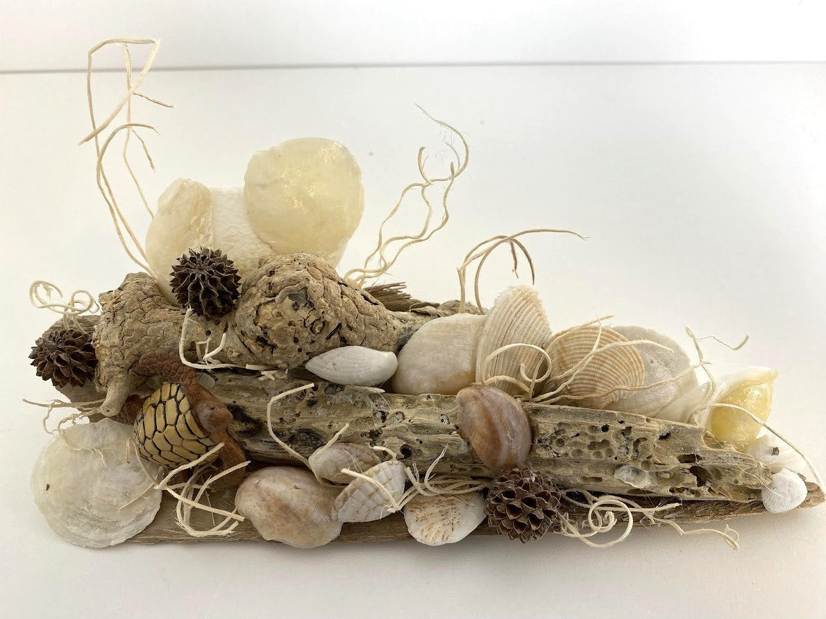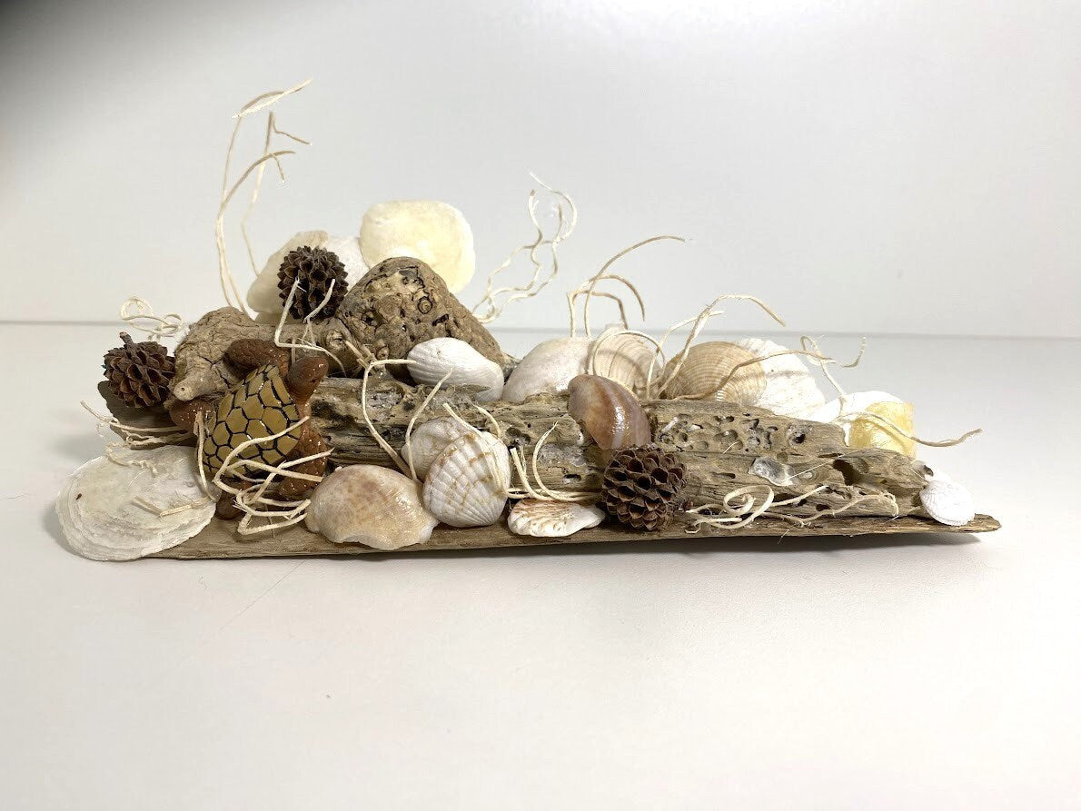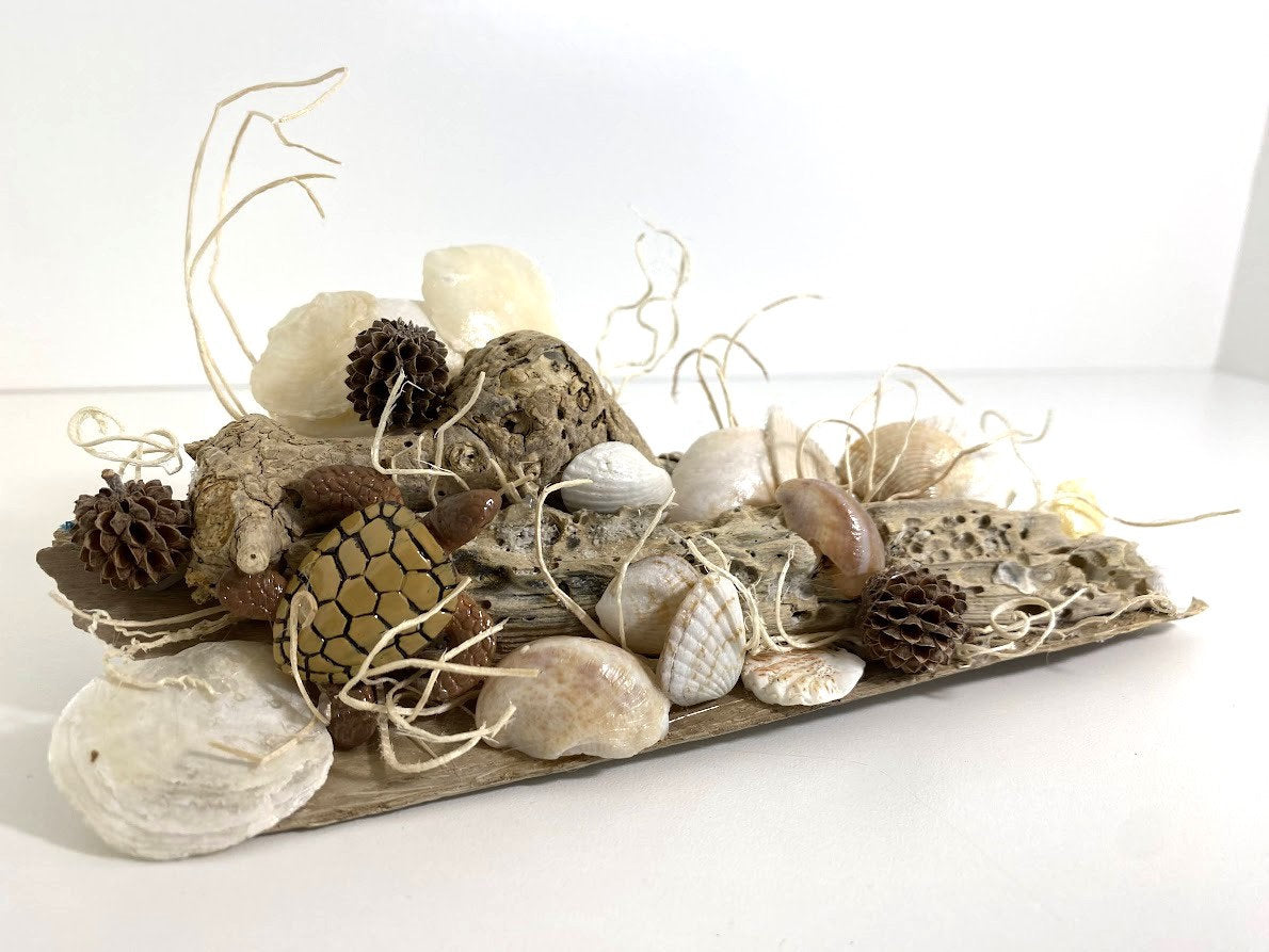 A delightful beach scene crafted from several small pieces of driftwood, adorned with locally collected shells, seed pods, and sea grass. All items, except the turtle, were collected on Long Boat Key Beach in FL. In the midst of this charming display, a tiny turtle is seen climbing the wood. This measures 8 “ long, 4” tall, and has a depth of 4". It's a miniature coastal treasure that captures the essence of the seaside in exquisite detail.