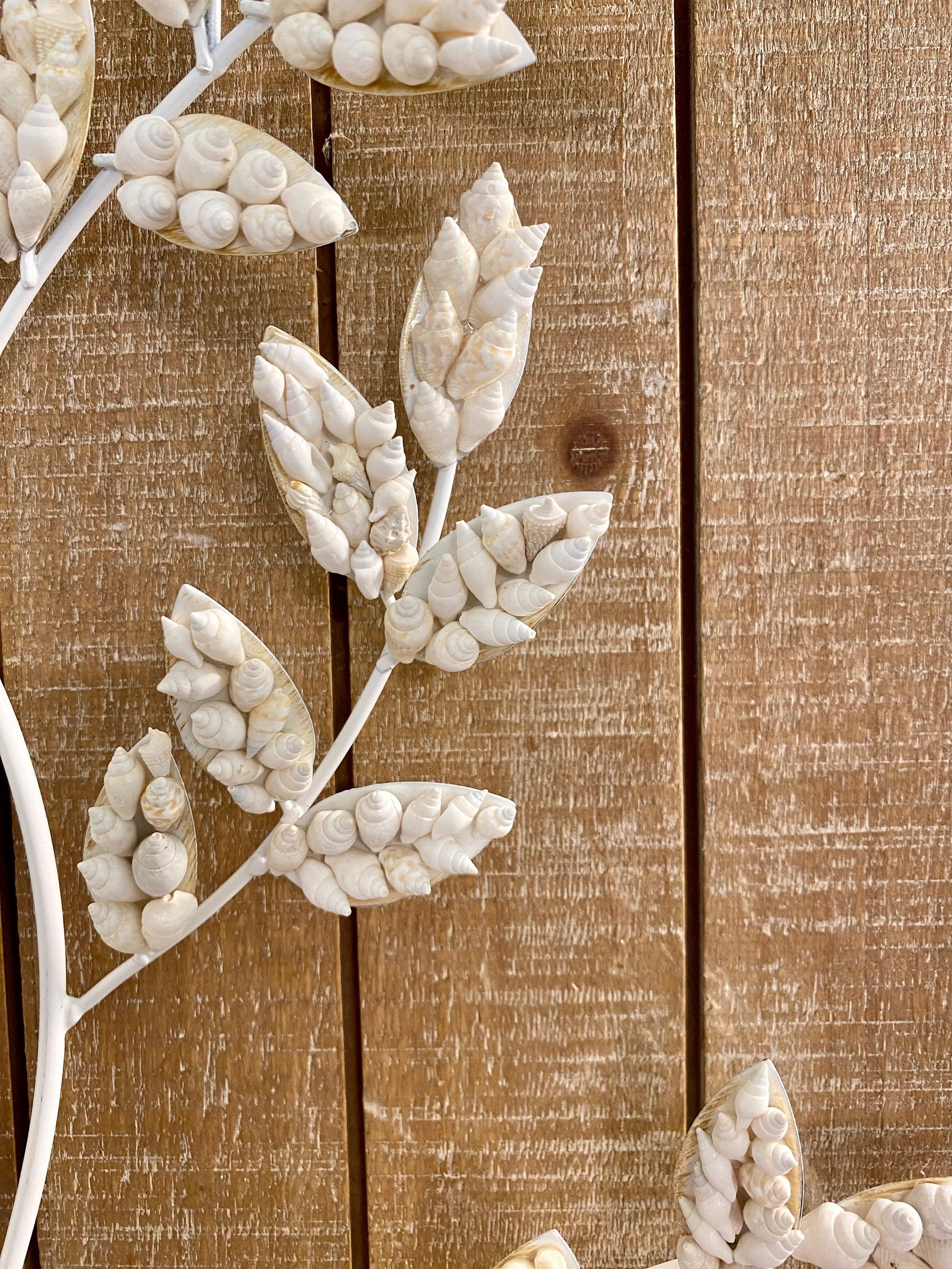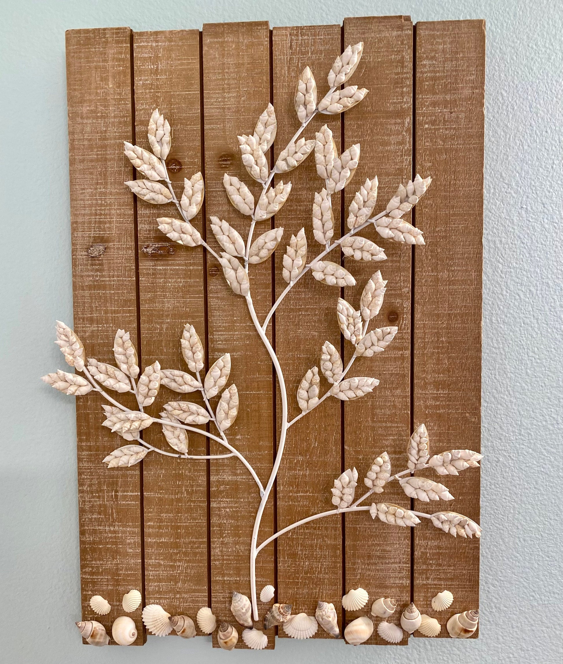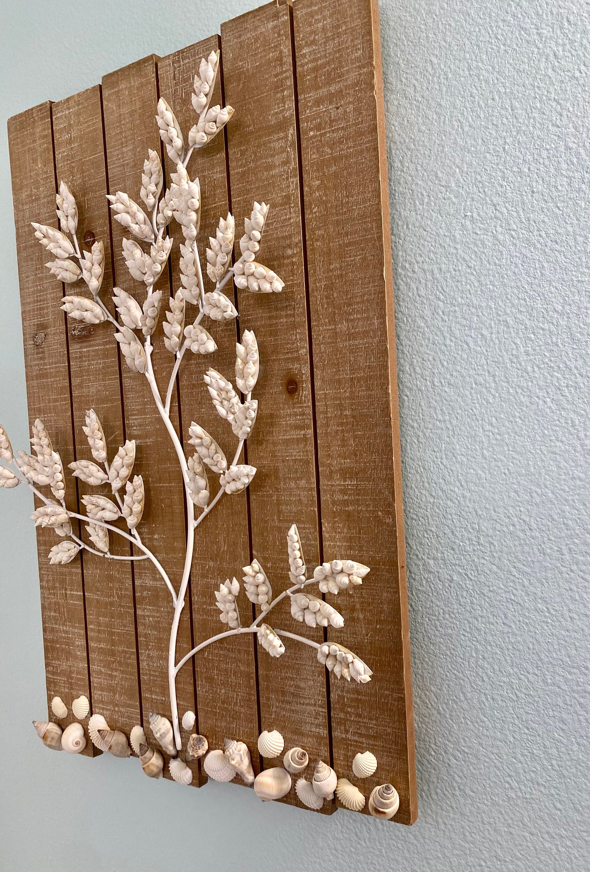 This product is a decorative wood plank measuring 19.25 inches by 13 inches. The plank is adorned with white metal branches that have been decorated with tiny white nassa shells, adding a beautiful natural element to the piece. The bottom of the plank features West Indie shells, which further enhance the piece's coastal aesthetic.