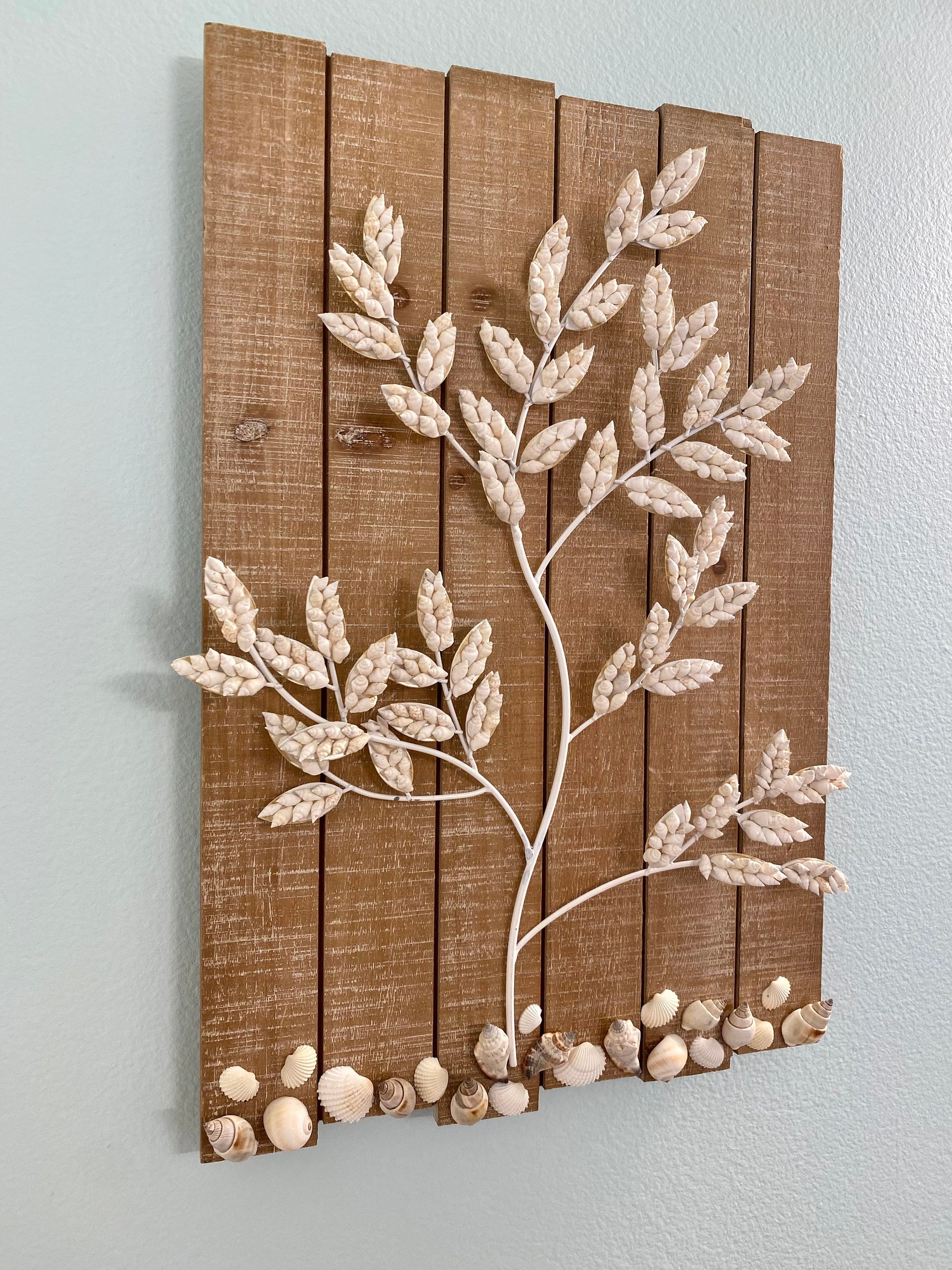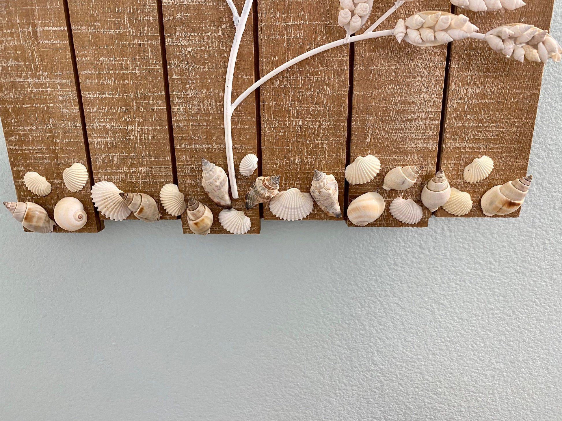 This decorative plank is designed to be hung on a wall, making it a great addition to any room in your home that could use a touch of coastal charm. The combination of the natural wood, metal, and shells creates a unique and eye-catching piece that is sure to be a conversation starter.
